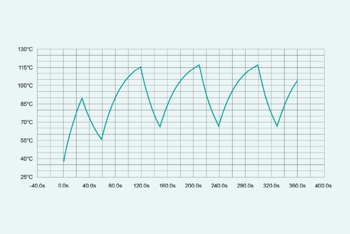 另一方面,在第三次实验室测试中(如图 10 所示),使用相同的热管理设置,平均功率增加至1.1 kW(50 V 时 22 A)。此测试的运行条件为 800 VHI 和 50 VLO;这是 BCM6135 支持的电压范围的高端。负载从 17.5 A 切换至 70 A,占空比为 10%(900 ms 为 17.5 A, 100 ms为 70 A)。在 7.5 分钟的测试时间内,传感器测得的内部温度为 100°C,且仍在上升(未达到稳态)。但 7.5 分钟(450 秒)的持续时间远超 20 秒,因此这是一个积极的信号,表明 BCM6135 可能满足某些主动悬挂的设计要求。