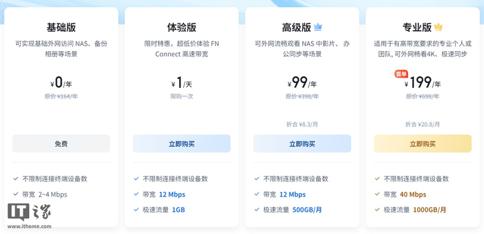 此外IT之家小伙伴反馈,飞牛 FN Connect 的远程连接开始推出收费服务,可选高级版和专业版,高级版价格为 99 元 / 年,专业版为 199 元 / 年。当然用户还可以选择免费的基础版,可实现基础外网访问 NAS、备份相册等场景。