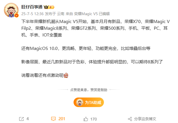 快科技7月6日消息,日前,数码博主“旺仔百事通”发文,称下半年荣耀新机潮从Magic V5开始,基本月月有新品。