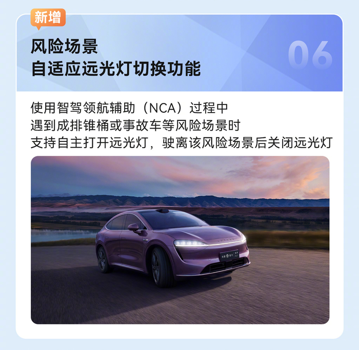 智界汽车新增风险场景自适应远光灯切换功能:使用智驾领航辅助 (NCA)过程中,遇到成排锥桶或事故车等风险场景时,支持自主打开远光灯,驶离该风险场景后关闭远光灯。