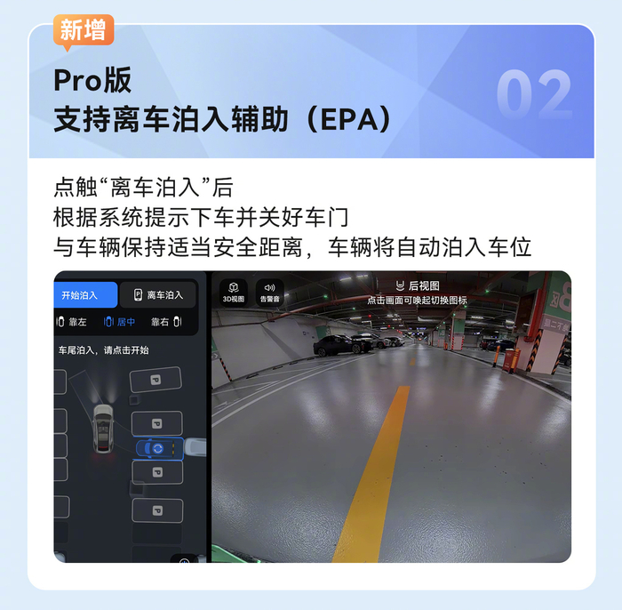 智界汽车新增 Pro 版支持离车泊入辅助(EPA):点触“离车泊入”后,根据系统提示下车并关好车门,与车辆保持适当安全距离,车辆将自动泊入车位。