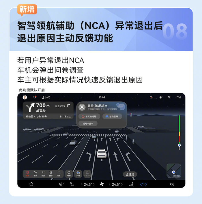 智界汽车新增智驾领航辅助(NCA)异常退出后主动反馈功能:若用户异常退出 NCA,车机会弹出问卷调查,车主可根据实际情况快速反馈退出原因。