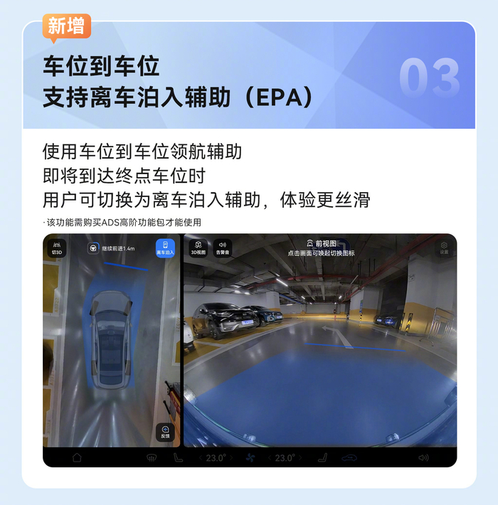 智界汽车新增车位到车位支持离车泊入辅助(EPA):使用车位到车位领航辅助,即将到达终点车位时,用户可切换为离车泊入辅助,体验更丝滑。