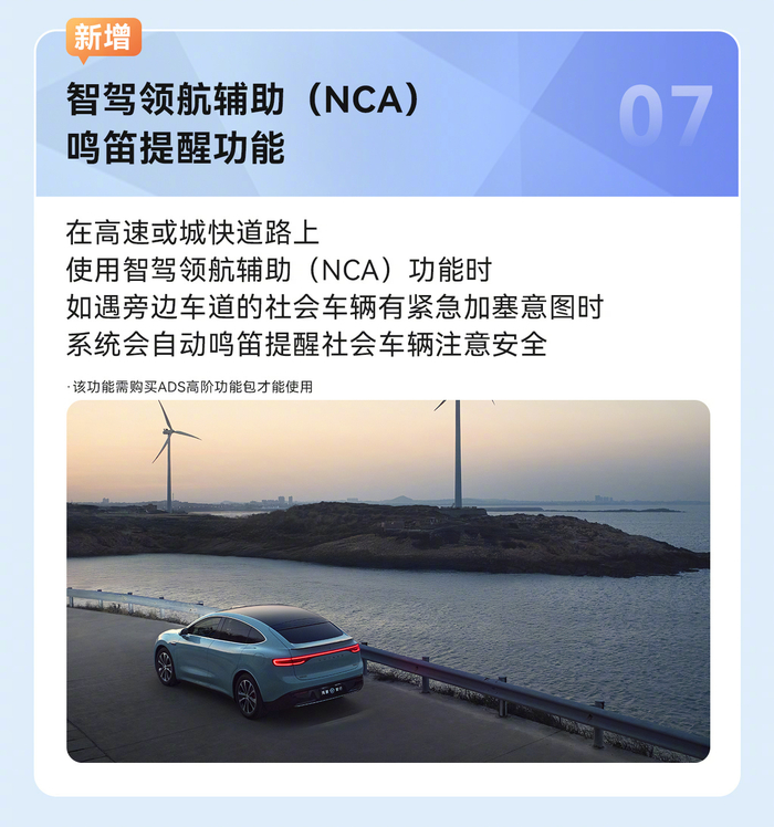 智界汽车新增智驾领航辅助(NCA)鸣笛提醒功能:在高速或城快道路上使用智驾领航辅助(NCA)功能时,如遇旁边车道的社会车辆有紧急加塞意图时系统会自动鸣笛提醒社会车辆注意安全。