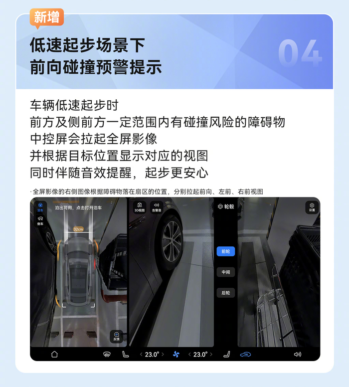 智界汽车新增低速起步场景下前向碰撞预警提示:车辆低速起步时,前方及侧前方一定范围内有碰撞风险的障碍物,中控屏会拉起全屏影像,并根据目标位置显示对应的视图同时伴随音效提醒。