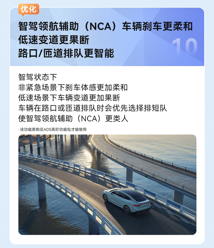 此外,智界汽车还优化了智驾领航辅助(NCA)系统的日常表现,使其刹车更柔和、低速变道更果断、路口 / 匝道排队更智能,车辆在路口或匝道排队时会优先选择排短队,使 NCA 更类人。
