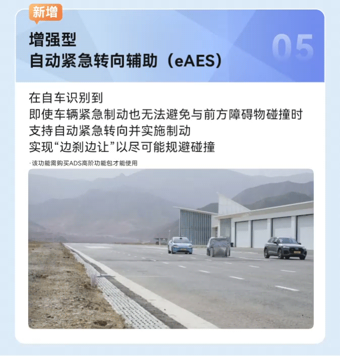 智界汽车新增增强型自动紧急转向辅助(eAES):在自车识别到即使车辆紧急制动也无法避免与前方障碍物碰撞时,支持自动紧急转向并实施制动实现“边刹边让”以尽可能规避碰撞。