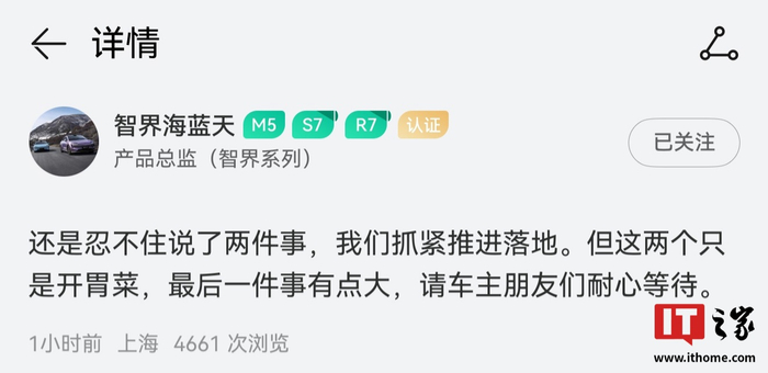 智界系列产品总监 @智界海蓝天 昨日发文称:“对智界的喧嚣已尘埃落地,智界加油,未来可期!”另外,他还表示“本周之后,智界可以全力向前奔跑”。
