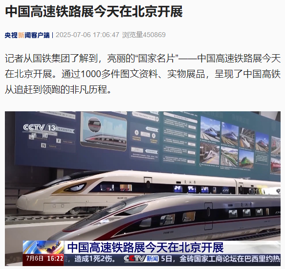 IT之家 7 月 6 日消息,据央视新闻报道,记者从国铁集团了解到,亮丽的“国家名片”—— 中国高速铁路展今天在北京开展。通过 1000 多件图文资料、实物展品,呈现了中国高铁从追赶到领跑的非凡历程。