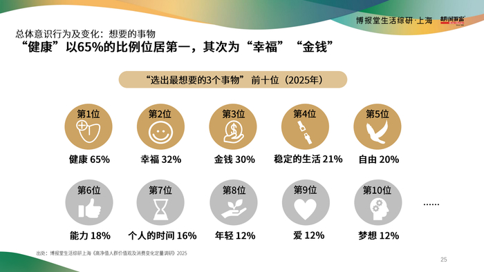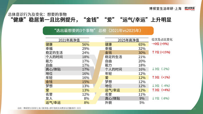 最关注事物前三位:健康(65%,+9%)、幸福(32%)、金钱(30%,+15%)。