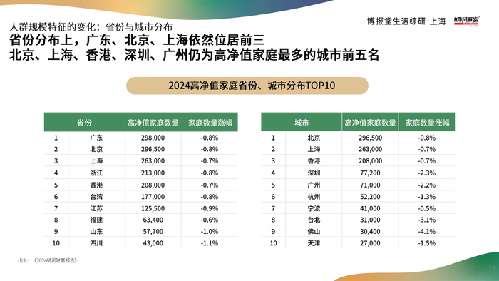 地域分布:广东(29.8万户)、北京(29.65万户)、上海(26.3万户)位居前三;深圳、广州高净值家庭数量分别下降2.3%、2.2%。