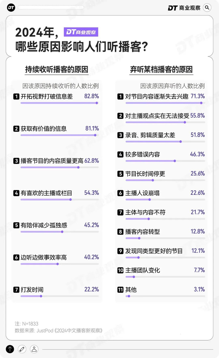 《2024中文播客新观察》报告显示,人们收听播客主要有两个原因,一是开拓视野、获得有价值的信息;二是获得陪伴感和情绪价值。