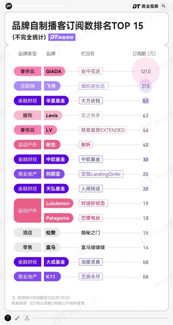 根据“DT商业观察”的不完全统计,过去五年间,超30个品牌/公司开始自制播客。