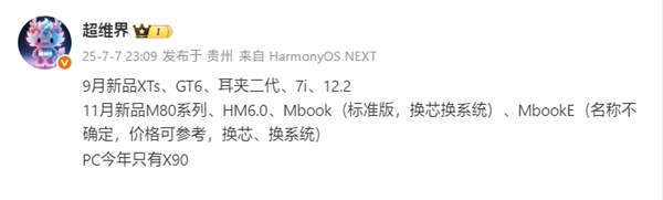 博主“超维界”曝光了华为下半年的新品节奏,其中9月份将发布Mate XTs三折叠,同时还有WATCH GT6系列、FreeClip耳夹耳机二代、Free Buds 7i、MatePad 12.2。