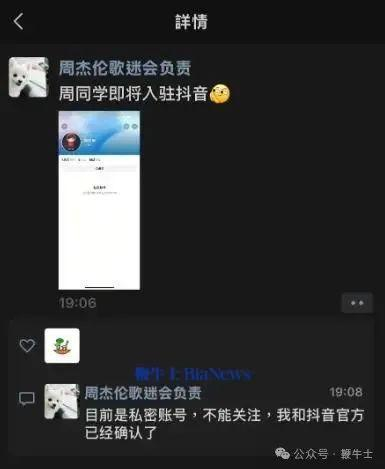 周杰伦歌迷会负责朋友圈证实此消息,称已经与抖音官方确认,目前已经有私密账号。