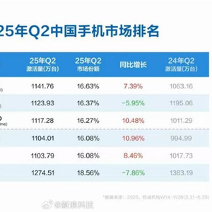 供应链权威市场调研机构的数据显示,2025年第二季度(W14-W26),小米以16.63%的份额,排名中国手机市场新机激活量第一,激活量1141.76万台,同比增长7.39%。