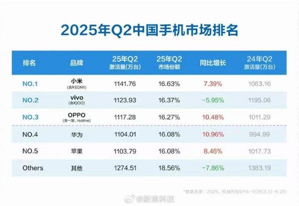 苹果快成Others!Q2中国手机市场排名:小米激活量第一 华为第四