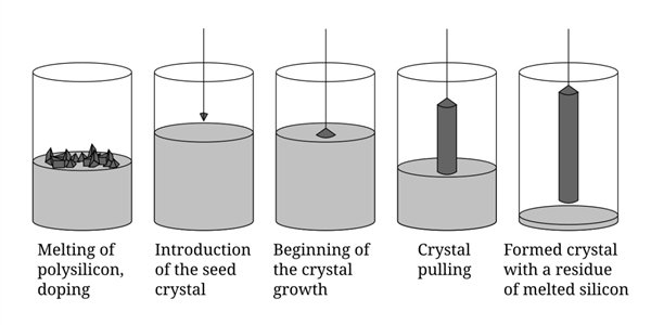 多晶硅被放入坩埚中加热至1420°C 熔化,一根单晶硅制成的 “晶种棒” 缓慢插入熔融的硅液中,同时精确控制旋转与拉升速度。