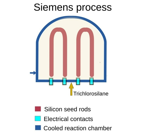 随后,三氯硅烷进入 “西门子法(Siemens Process)” 的提纯环节:在 1100°C 的钟形反应炉中,经过蒸馏净化的三氯硅烷被气化还原,硅原子逐渐沉积在炉内的载体上,形成高纯度的多晶硅棒。