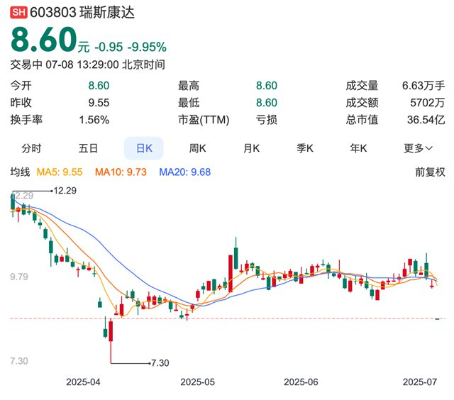 受该消息影响,瑞斯康达股价今日一直跌停,总市值36.54亿元。