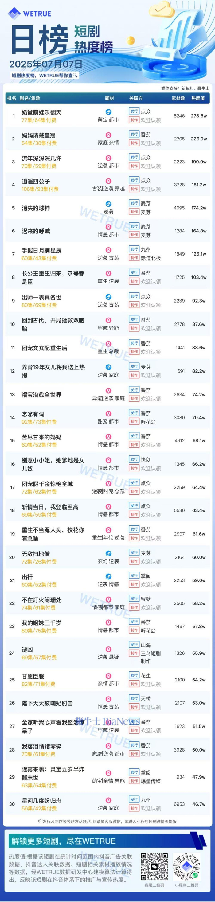 7日短剧热度榜:《奶爸萌娃乐翻天》第一,大盘热度5021万