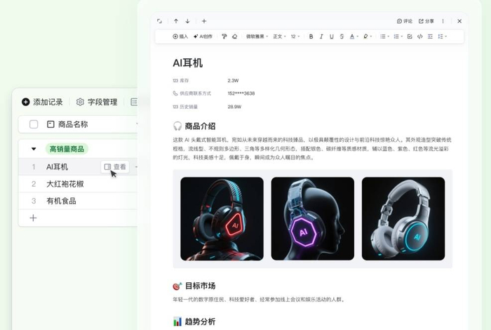 多维表格解决了让企业的流程能并行起来痛点,在大模型的赋能下,AI则成为协同办公软件表格能力持续进化的助燃剂。在AI表格中,“表格即文档”功能实现了将文档融入数据表。基于此,表格的每一行记录都是一个独立的文档,用户可以像平时写文档一样自由输入和查看信息,进而拓展了 AI 表格的应用场景。