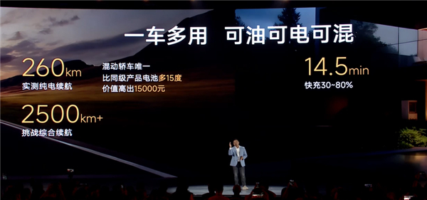 匹配33.68kWh犀牛方电池组,CLTC纯电续航超200km,部分版本实测纯电续航可达260km,综合续航突破2500km,支持快充,30%-80%快充仅需14.5分钟,同时还拥有3.3kW对外放电功能。