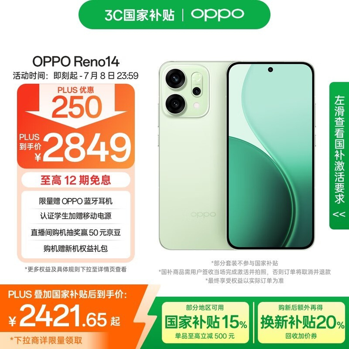 OPPO Reno14 12GB+512GB半夏绿手机限时特惠价2421元