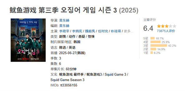 《鱿鱼游戏》第三季豆瓣仅6.4分 网友:看完想把男主角打一顿