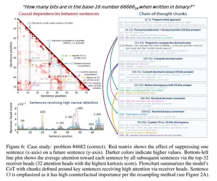 上述过程基于作者对注意力模式的分析:接收头精准定位了发起计算或陈述关键结论的句子,从而将推理轨迹划分为具有明确意义的模块(图 6)。