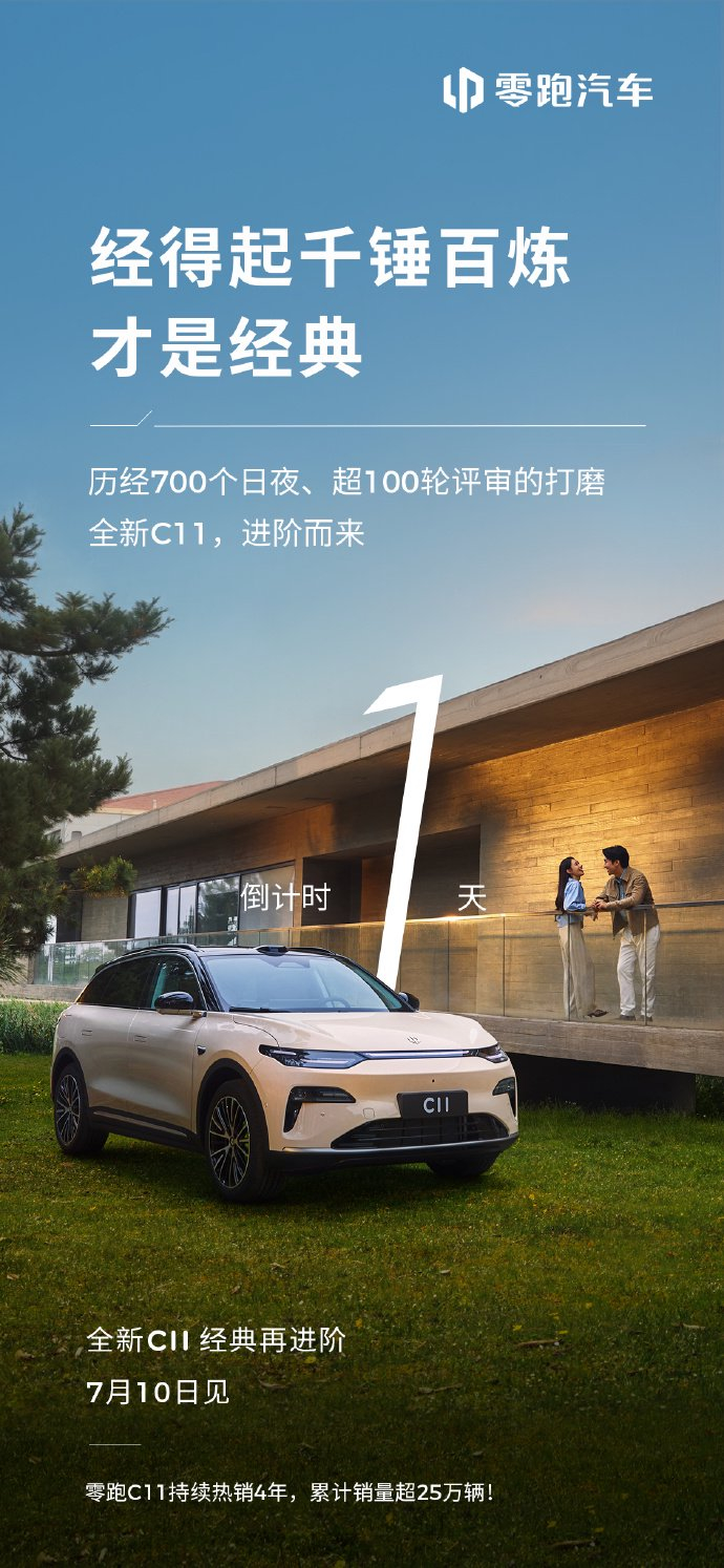 IT之家 7 月 9 日消息,零跑汽车 2026 款全新 C11 上市发布会将于 7 月 10 日 19:00 举行,号称“3 大代际跃升、125 项越级标配”。