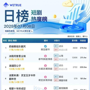 1、本日榜为WETRUE短剧数据公司提供,新腕儿和鞭牛士提供联合支持。