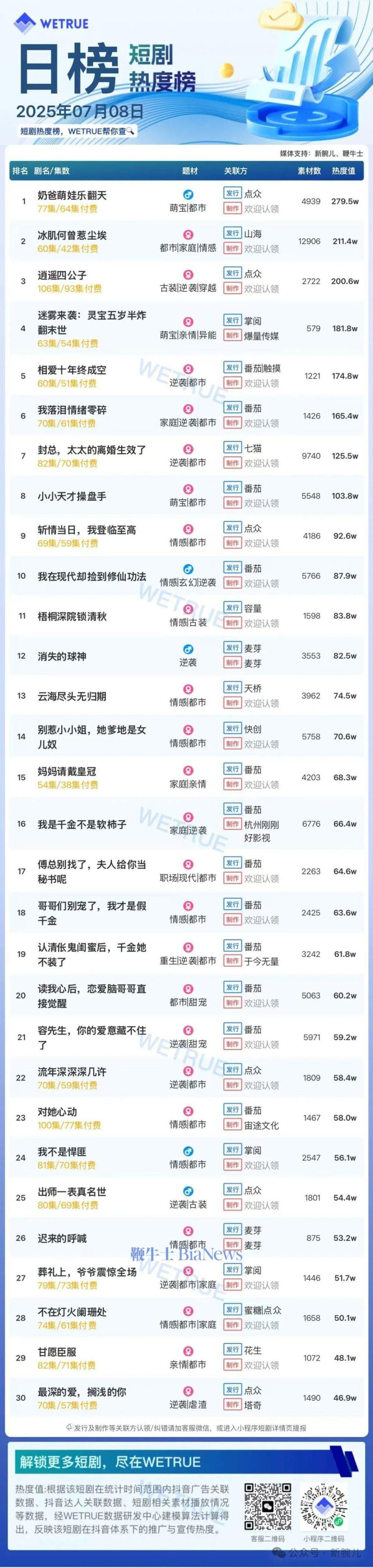 8日短剧热度榜:《奶爸萌娃乐翻天》第一,大盘热度5002万