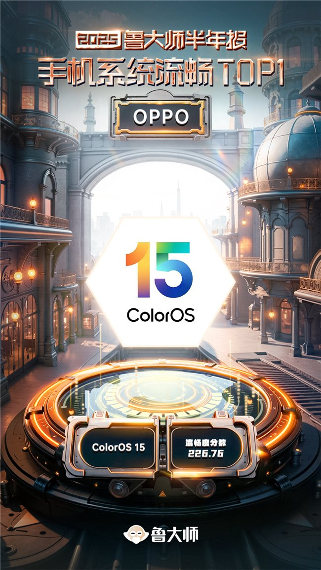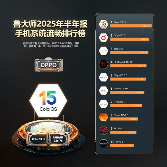 ColorOS 15最终取得226.76流畅分,继续占据2025半年报手机系统流畅榜首。目前ColorOS,也是连续4个季度坐稳鲁大师系统流畅度冠军宝座。