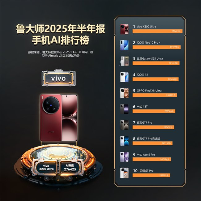 子品牌iQOO Neo10 Pro+、iQOO 13紧随其后,分别位于榜单第二、第四名。三星Galaxy S25 Ultra基于Galaxy AI处于iQOO两者之间。
