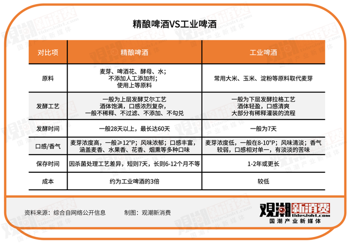 多维度对比可见,精酿啤酒在品质和口感上全方位碾压工业啤酒;不止如此,还暗合了健康无添加、新鲜短保、丰富口味等当下饮品的热门趋势。和“越来越淡”的普通啤酒相比,精酿成为更能满足啤酒脑袋的选择。