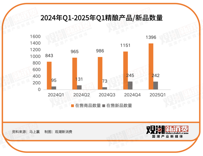 据线下零售监测机构马上赢数据显示,在售精酿商品数量从2024年Q1的843款,增长至2025Q1的1396款,增长率65.60%;在售新品数量则从95款增长至242款,增长率高达154.74%。