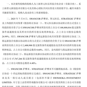 本次权益变动后,智元恒岳和致远新创合伙合计将拥有上市公司29.99%的股份及该等股份对应的表决权,公司控股股东将由SWANCOR萨摩亚变更为智元恒岳,邓泰华将成为上市公司实际控制人。