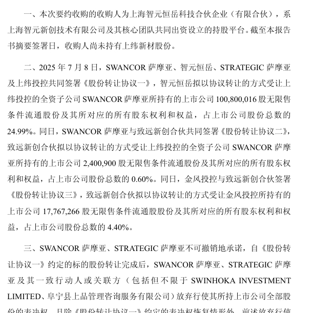根据上纬新材公告,智元恒岳拟以协议转让方式受让上纬投控全资子公司SWANCOR萨摩亚所持的公司1.01亿股股份,占公司总股本的24.99%;致远新创合伙拟以协议转让的方式受让SWANCOR萨摩亚所持有的公司240.09万股股份,占公司总股本的0.6%;致远新创合伙拟以协议转让的方式受让金风投控所持有的公司1776.73万股股份,占公司总股本的4.40%。同时,智元恒岳拟通过部分要约收购方式进一步增持公司股份,要约收购数量为1.49亿股,占公司总股本的37%。