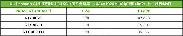 PRIMERTX5060 Ti支持FP4精度,因此在对应的AI计算中相对使用FP8效率更高、显存占用更低。我们用ULProcyon AI生图对显卡的FP4性能进行测试,可以看到,原生支持FP4的PRIMERTX5060 Ti成绩非常抢眼,上代显卡由于不支持FP4模式,在FP4模式下的出图效率很低。PRIMERTX5060 Ti,比RTX4080都快了58%,比旗舰RTX4090 D也快了4%,对于那些需要借助AI工具完成简单的AIGC创作的用户来说,PRIMERTX5060 Ti无疑是效率更高的选择。