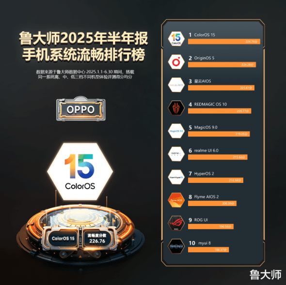 近日,有第三方送出了2025年上半年手机系统流畅度的排名,其中OPPO的ColorOS 15夺下第一。