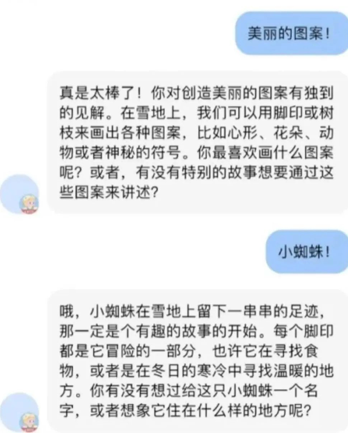 两人都提到,AI生成的对话,对孩子来说太长了。“孩子是一个知识有限的小模型,而AI是一个集合了全人类知识的大模型,二者在知识上是不对等的。”