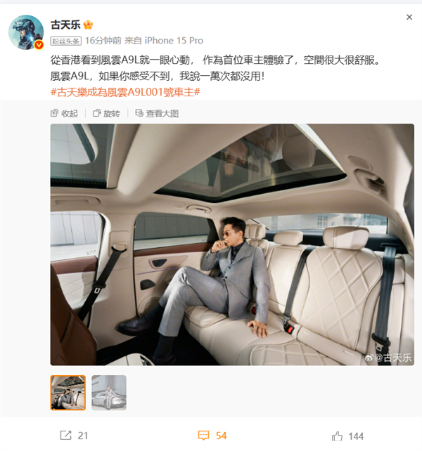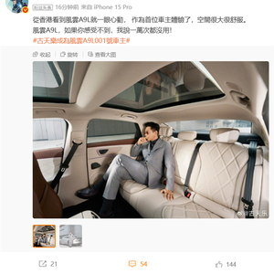 “从香港看到风云A9L就一眼心动,作为首位车主体验了,空间很大很舒服。风云 A9L,如果你感受不到,我说一万次都没用!”他在微博上写道。