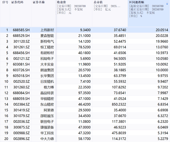 从行业板块看,机器人概念表现活跃,上纬新材、豪森智能、大丰实业、朗迪集团等多股涨停,晶品特装、华锐精密、东山精密、阿莱德等涨超6%。