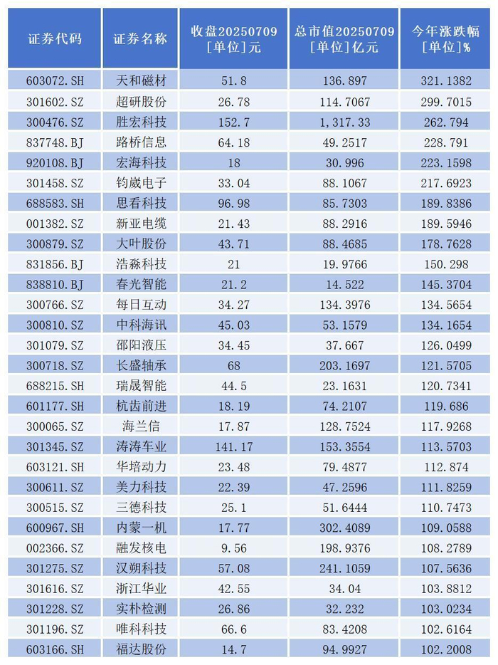 从二级市场表现看,今年以来,A股机器人概念板块已诞生29只**股,其中,天和磁材、超研股份、胜宏科技、路桥信息、宏海科技、钧崴电子涨幅均超过200%。