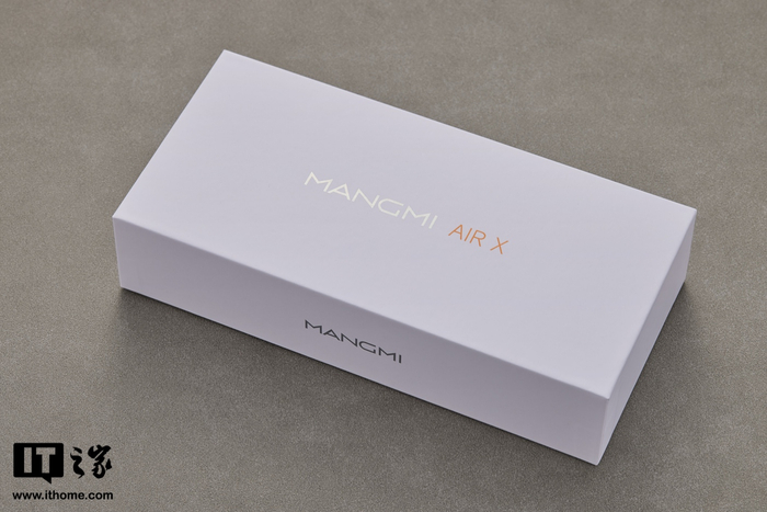 最后是包装盒配件,MANGMI AIR X 的包装盒同样极简,正面印有产品标识,底部则为产品各种信息。配件方面,除了主机之外,还有说明书、USB-A 转 USB-C 充电线及一张贴膜。