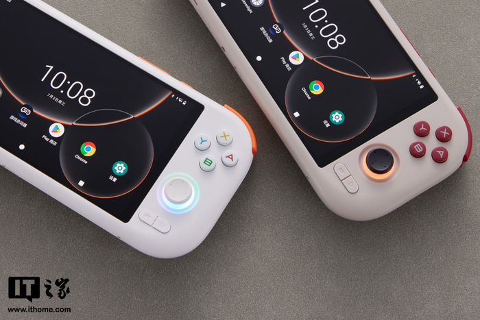 按键布局方面,该机整机布局有点类似于任天堂 Switch(摇杆方面布局有一些差异),方向键 / ABXY 按键为导电胶材质,摇杆及扳机均采用霍尔效应传感器,其中摇杆支持下压,摇杆帽支持拆卸自行更换,摇杆处带有 6700 万色 RGB 焕彩灯效,在玩游戏时具有一定沉浸感,同时玩家也可以在系统中配置 RGB 灯显示模式(恒亮、呼吸、彩虹)。