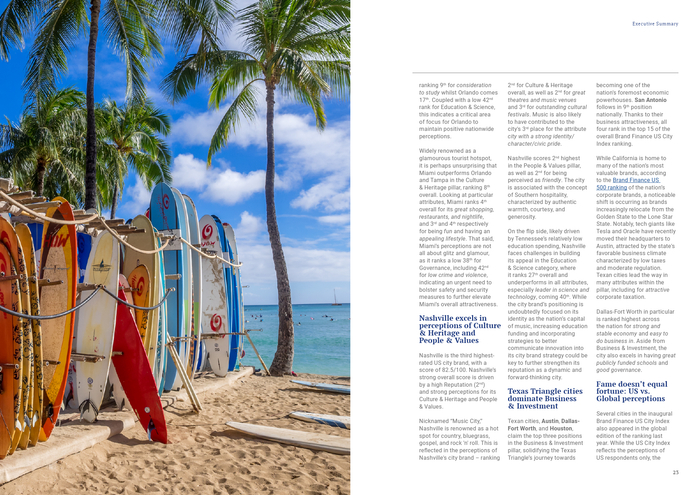 排名第一的城市品牌檀香山在可持续性和交通方面领先。它在整体支柱中排名第一,在清洁城市关心环境和绿色空间和娱乐的两个基本属性中排名第一。