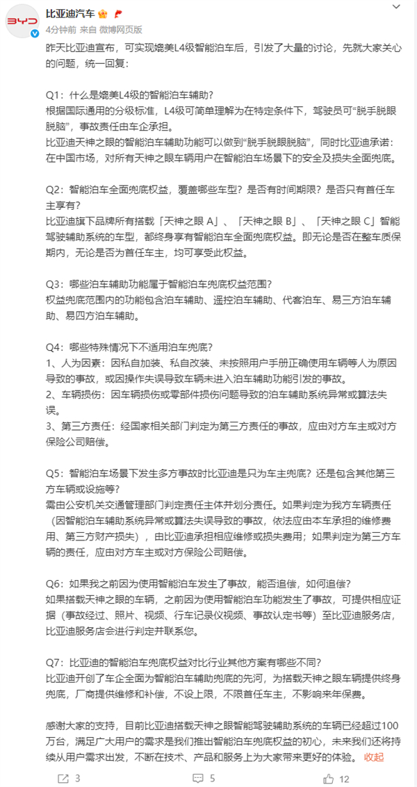 车主放心用 撞了车企赔!比亚迪详解“媲美L4级智能泊车”权益