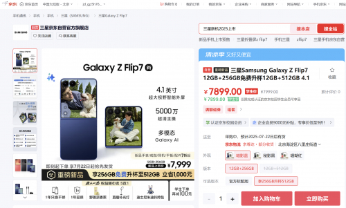 三星Galaxy Z Flip7售价7999元起,Z Flip7 FE售价5999元起且支持国家补贴立减500元,学生用户可再减100元。值得一提的是,用户购买Z Flpi7与Z Flip7 FE可享1年只换不修、1年延保、野兽派香薰、直播补光灯、迪士尼朱迪斜挎包权益随心选5选1。在购买上述手机同天下单新品手表等三星产品还可享额外折扣,福利满满。